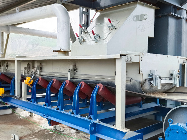 原料經過電子秤進入到皮帶輸送機中,由全封閉的提升機將物料入到五孔碾磨制砂機內進行破碎處理,再由空氣篩對破碎后的物料進行篩分處理,篩分后的較大物料會返回五孔碾磨制砂機中進行二次破碎,符合要求的砂子則進行裝載外運;篩分過程中的粉塵會經粗細粉分離機進入到布袋收塵器中,而其中較大的粗顆粒會在粗細粉分離機的作用下,按需求在成品砂中進行回摻,細粉塵將通過風力進入到布袋收塵器再次回收利用。